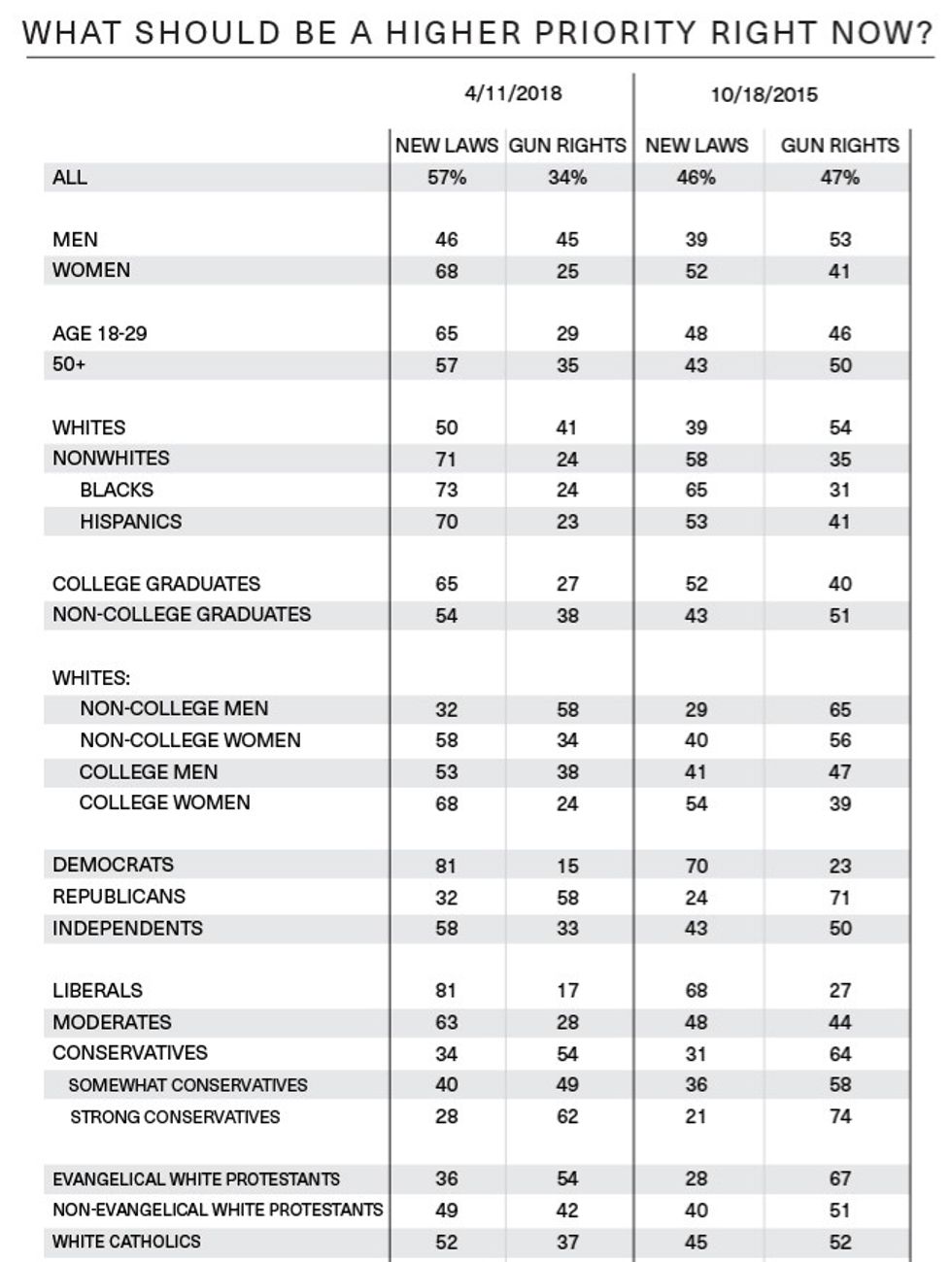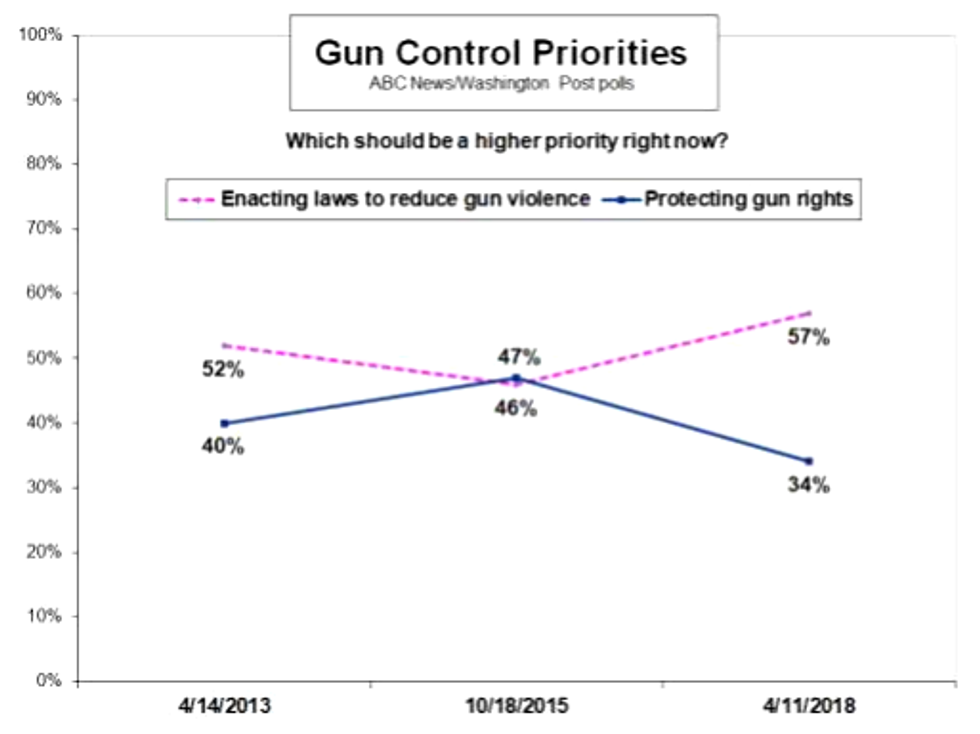 In an analysis of trends, American voters flipped from October 18, 2015 to April 11, 2018. In 2015, 47 percent of USA voters supported gun rights over 46 percent supporting gun control. Now, 57 percent support gun control over 34 percent supporting gun rights.