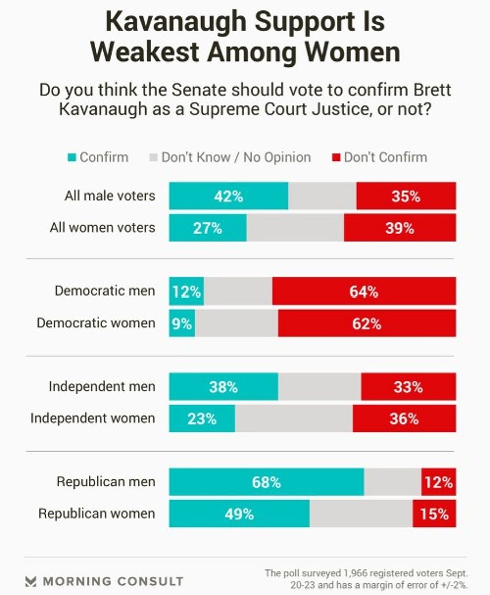 Although voter opposition to Kavanaugh exceeds his support in several major polls, the recent Politico Morning Consult poll noted a gender gap in their results.