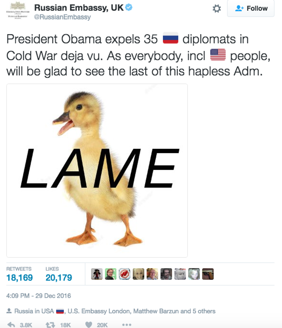 Even before the Russian Foreign Ministry recommended expelling US diplomats, Russian Prime Minister Dmitry Medvedev issued a scathing response to the new sanctions, accusing the Obama administration of ending its tenure "in anti-Russian agony." The Russian embassy issued a message of its own, later writing that the sanctions will not be considered "just as (an) unfriendly act."