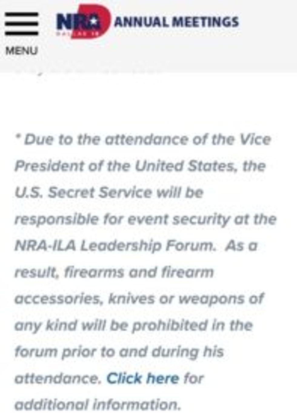 The NRA issued guidance to all attendees that all "firearms and firearm accessories, knives or weapons of any kind" are forbidden from the convention due to the Vice President's attendance.