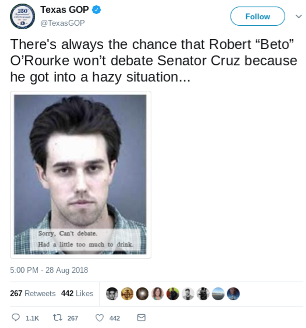 On Tuesday, in an effort to bolster Ted Cruz's image, the Texas Republican Party posted an altered image of Beto O'Rourke's mugshot from 1998. They altered the photo to add "Sorry. Can't debate. Had a little too much to drink."