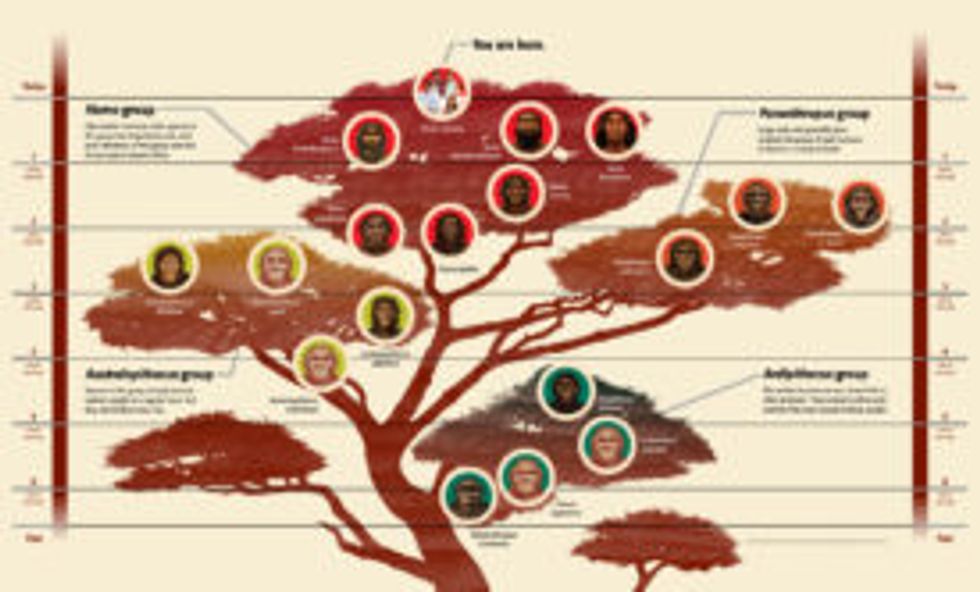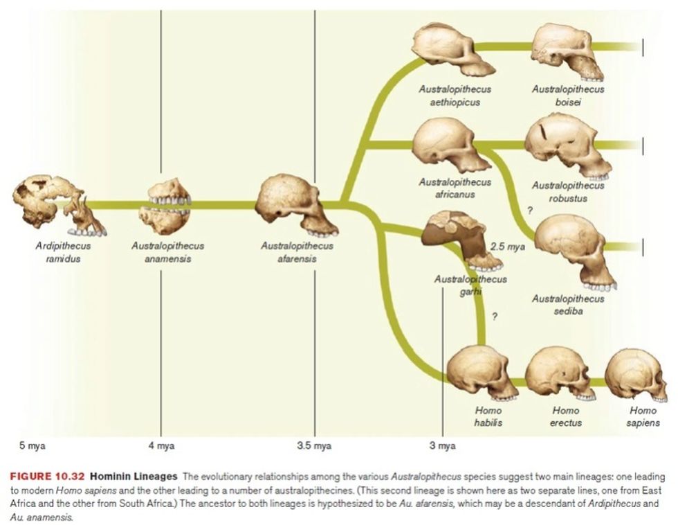 Lucy and present-day humans are both classified as hominids, which is the term used for all members of the biological family Hominidae. Hominids (“Great Apes”) are primates that include today’s orangutan, gorilla, chimpanzee, bonobo, and human. Present day humans are of the subclassification genus Homo (which means “human”) and the species sapien. Though Homo sapiens are the only humans today, there have been other humans in the past: on the same evolutionary branch are the now extinct Homo neanderthalensis, and our ancestor Homo erectus. All human species past and present are distant descendants of Lucy’s species.