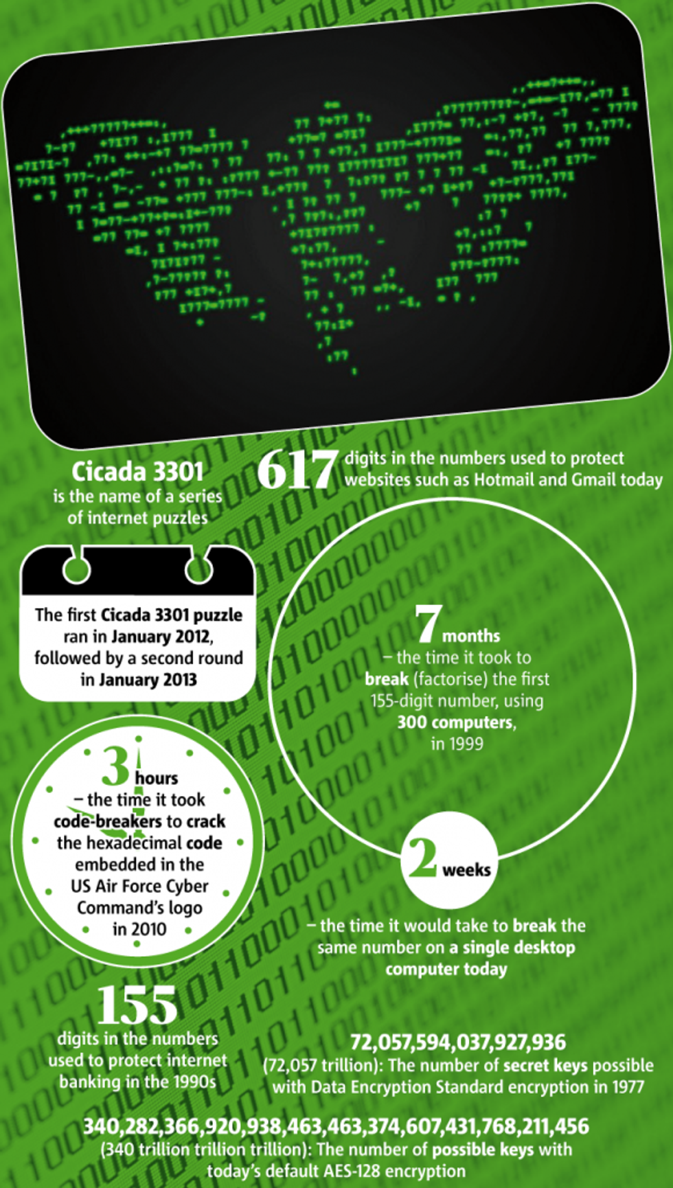 There are a few clues to discern from the organization’s name alone. There is a link between the cicada insect and the number 3301. Cicadas have developed a unique life cycle to cope with predators; according to National Geographic, they remain underground ground for 13 or 17 years before emerging again. Similarly, 3301 is a prime number, divisible only by 1 and itself.
