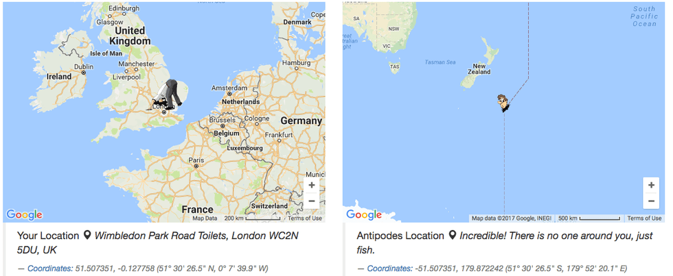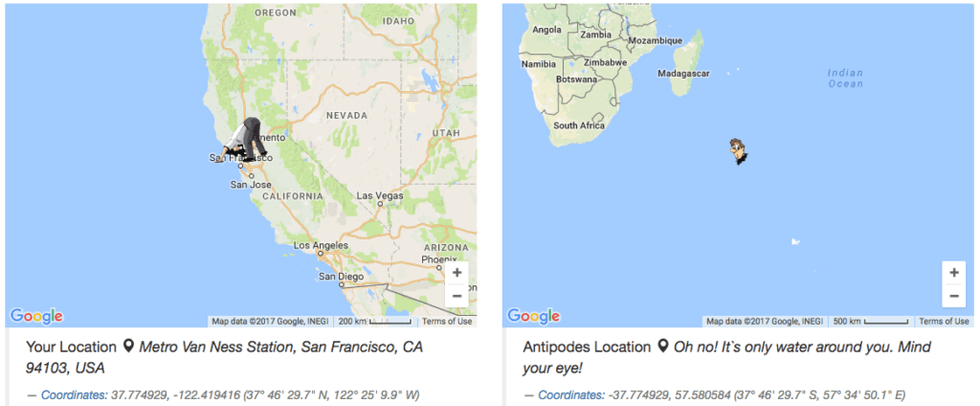 According to this map, you won’t end up emerging in a picturesque rice paddy or popping up through a manhole in downtown Beijing. You’d end up somewhere in the middle of the Indian Ocean.