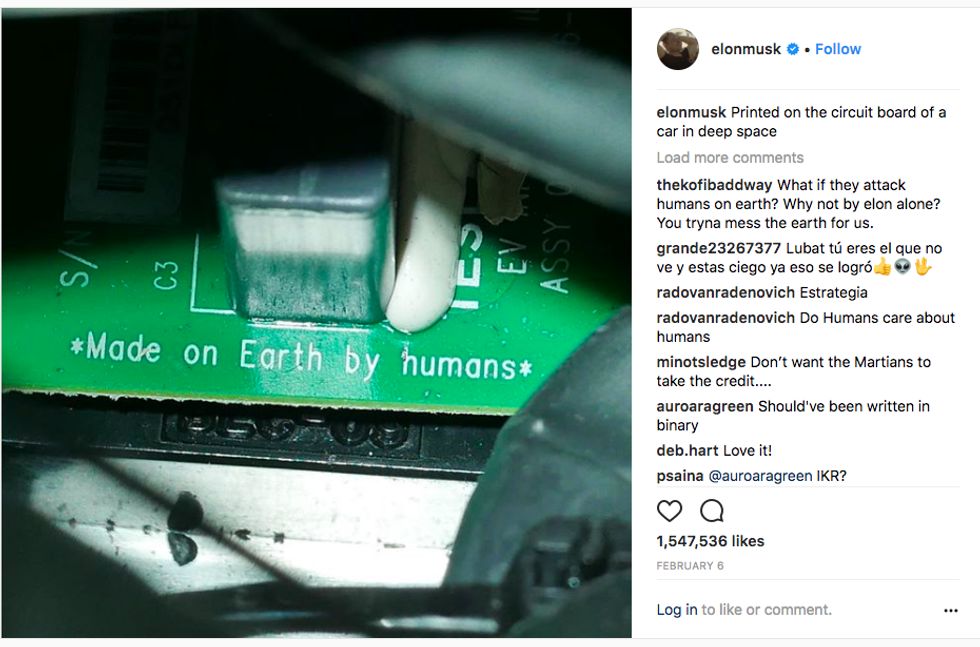 After much of the attention over his most recent achievement had died down, Musk posted a picture on Instagram with a caption “Printed on the circuit board of a car in deep space. “