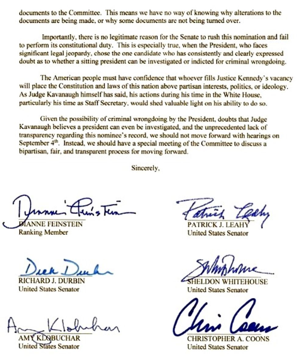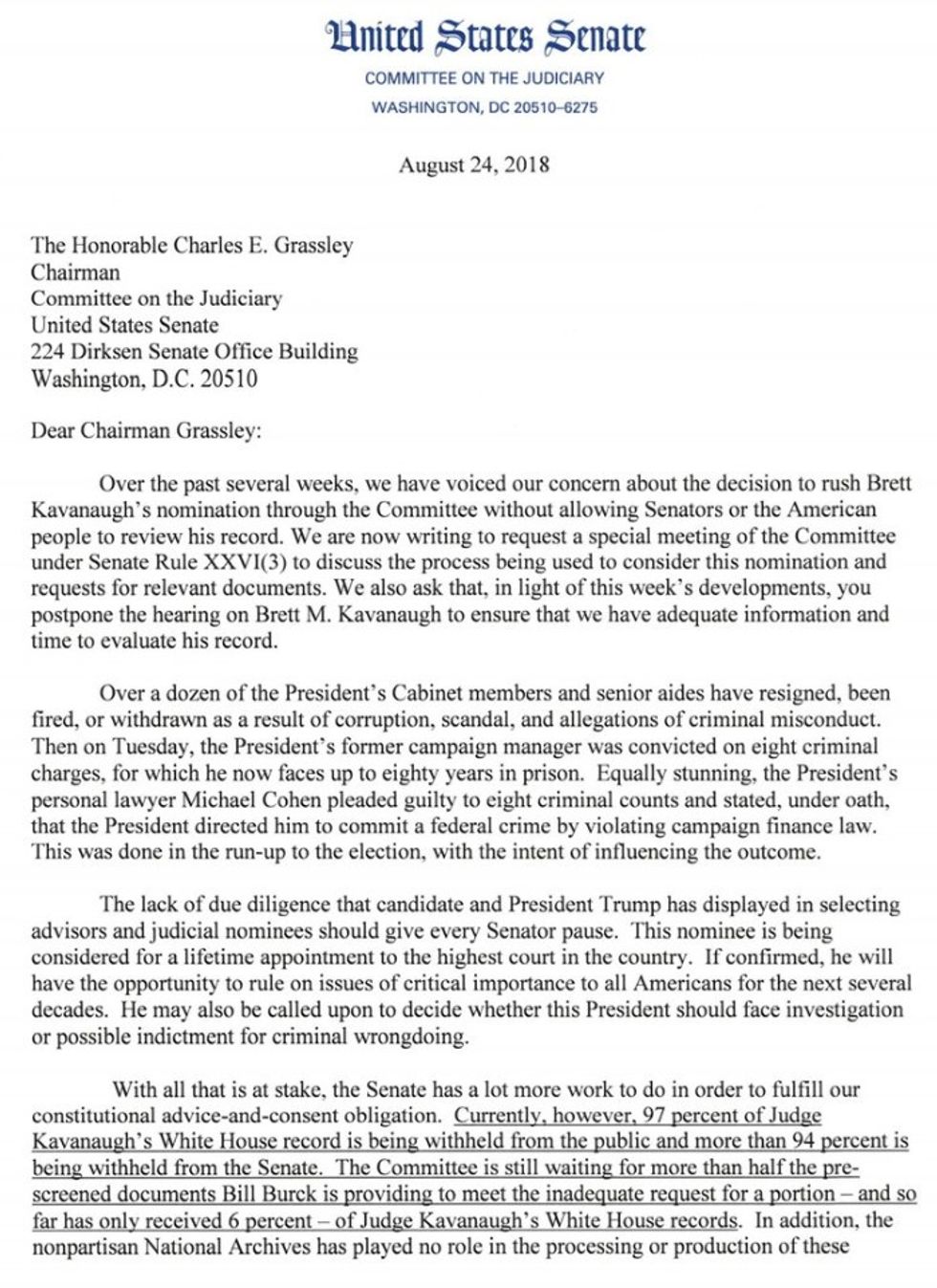 "Given the possibility of criminal wrongdoing by the President, doubts that Judge Kavanaugh believes a president can even be investigated, and the unprecedented lack of transparency regarding this nominee’s record, we should not move forward with hearings on September 4th."