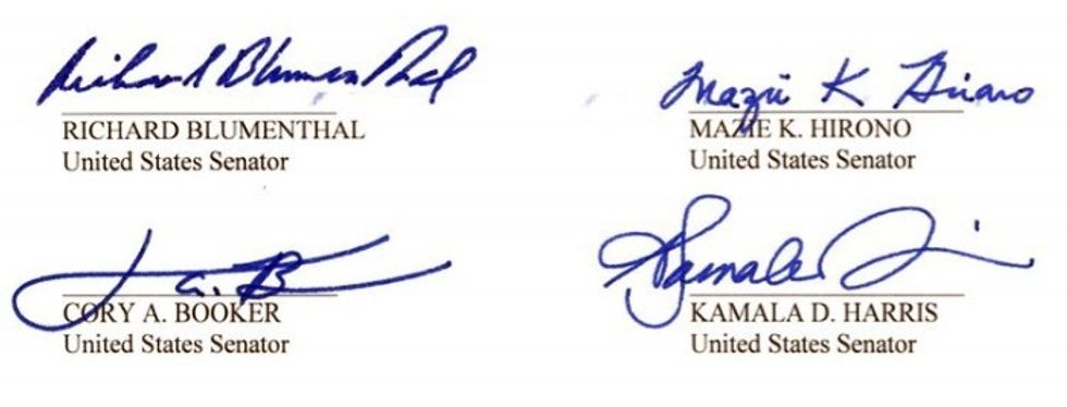 The letter was signed by Dianne Feinstein-Ranking Member (CA), Patrick Leahy (VT), Richard Durbin (IL), Sheldon Whitehouse (RI),Amy Klobuchar (MN), Christopher Coons (DE), Richard Blumenthal (CT), Mazie K. Hirono (HI), Cory Booker (NJ) and Kamala Harris (CA).