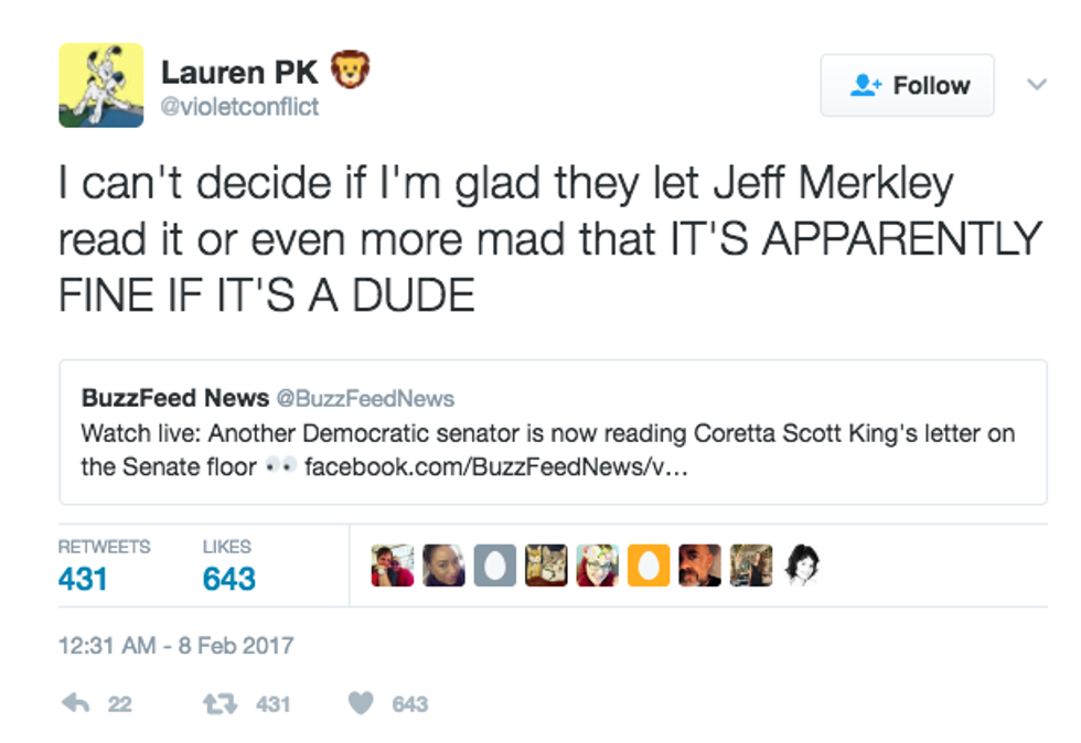 Warren turned the tables quickly on her silencers, however, by going live on Facebook just outside the Senate doors and reading the entirety of King's letter. The video has since gained over 5.3 million views, causing many to remark that McConnell's move ironically brought even more attention to the King letter and its contents.