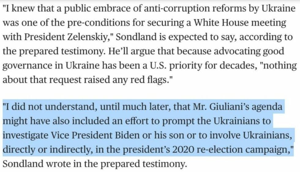 Sondland stated President Trump directed Giuliani to make contact with Ukrainian officials with the purpose of gaining their help with Trump's 2020 reelection campaign.