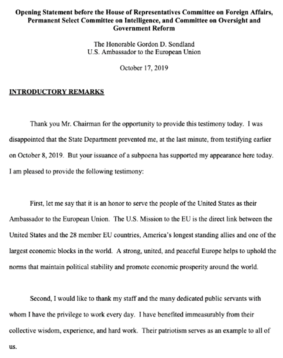In his opening remarks, Sondland thanked the House Committee and apologized for not appearing previously because of the Trump administration directive.