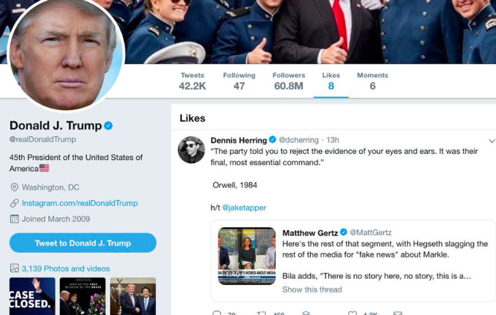 As others retweeted Tapper's message, President Trump actually liked the dig against the "alternative facts" of his administration. Brian Stelter, CNN's chief media correspondent noted Trump's like of the Orwell quote.