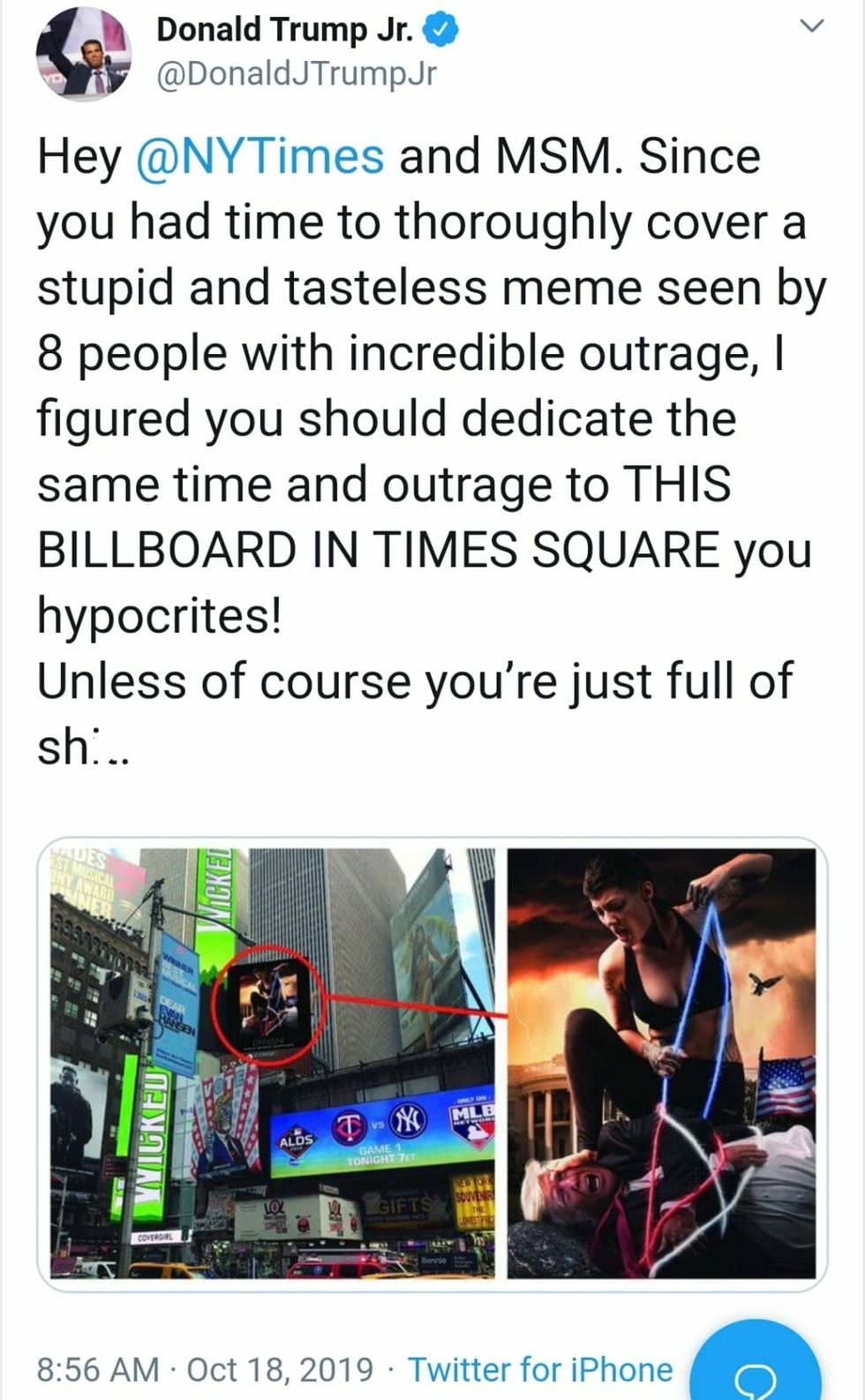"Hey [New York Times] and [mainstream media]. Since you had time to thoroughly cover a stupid and tasteless meme seen by 8 people with incredible outrage, I figured you should dedicate the same time and outrage to THIS BILLBOARD IN TIMES SQUARE you hypocrites!