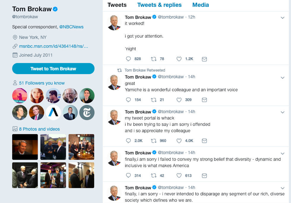 But Brokaw's scattered apology prompted many to wonder if he actually knows how Twitter works. Just have a look at his feed: