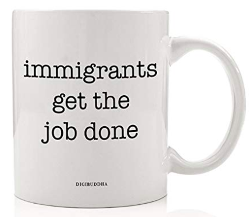 This mug, available here, shares the message that immigrants, together with those brought to the USA by force and the Indigenous people, get the job done.