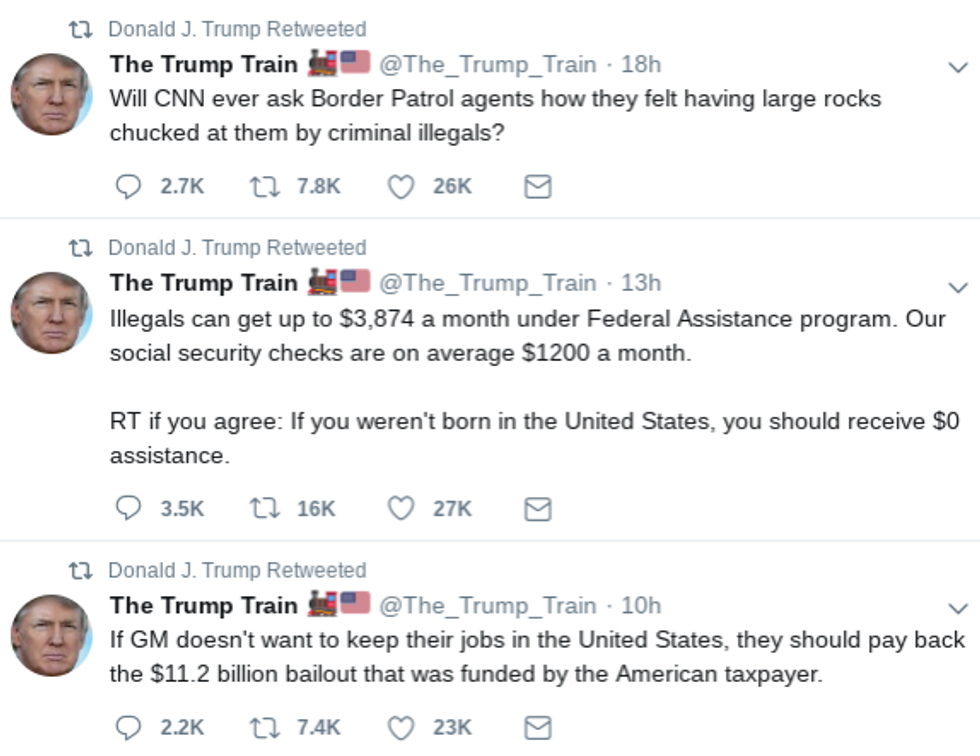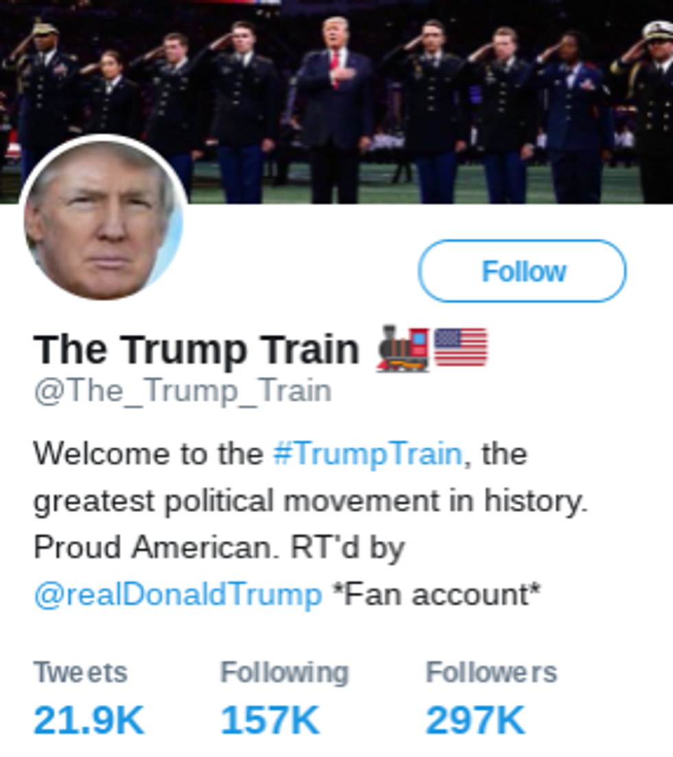 Most of the retweets came from the Twitter account "The Trump Train." Self-described as "Welcome to the #TrumpTrain, the greatest political movement in history. Proud American. RT'd by @realDonaldTrump *Fan account*", the account posts memes and false claims from conspiracy theories to outright lies.