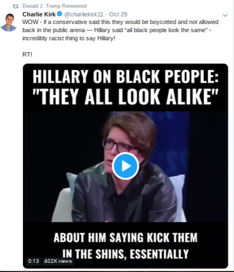 ...ending with a video clip of an interview with Hillary Clinton posted by conservative media personality Charlie Kirk where he tries to claim Clinton is racist.