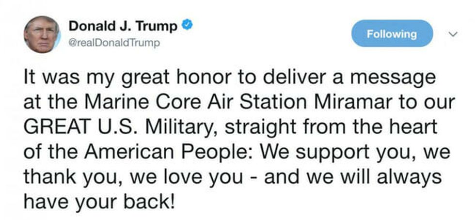 “It was my great honor to deliver a message at the Marine CoreAir Station Miramar to our GREAT U.S. Military, straight from the heart of the American People,” Trump wrote after visiting the Marine Corps Air Station Miramar in San Diego, where he addressed United States Marine troops. “We support you, we thank you, we love you – and we will always have your back!”