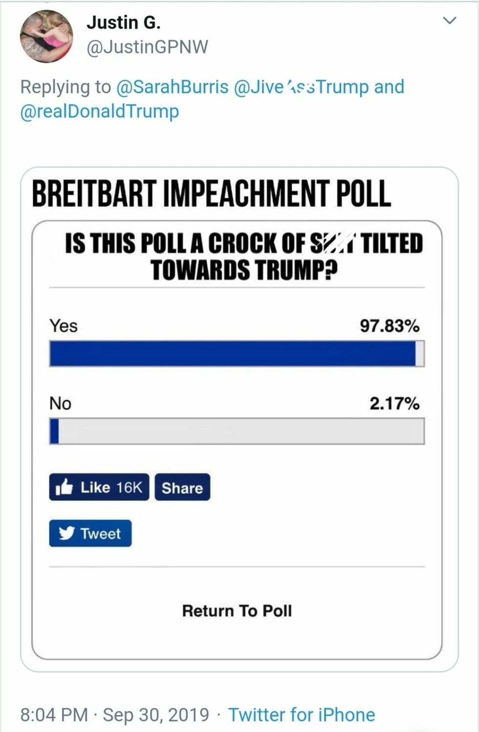 As expected by anyone familiar with right wing Steve Bannon-founded publication Breitbart, polls from that source showed a different story. The Breitbart poll showed the only story President Trump was willing to entertain—Americans were overwhelmingly against impeachment.