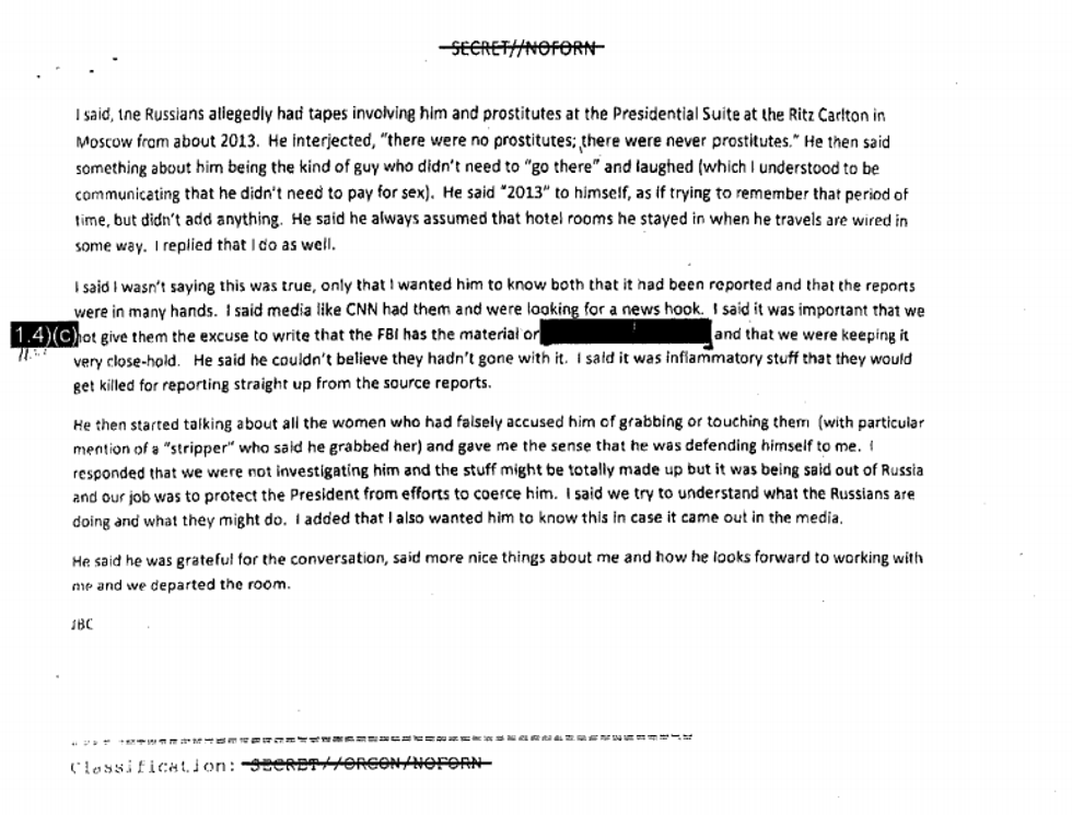 Indeed, one of Comey's more damaging accounts tells of the time he noted the president’s pointed obsession with the allegations described in the controversial dossier compiled by former British intelligence agent Christopher Steele, which includes a graphic account of Trump’s sexual encounter with prostitutes during a 2013 trip to Moscow. The dossier raises the possibility that the encounter––including moments when Trump and the women engaged in water sports––could have been caught on video.