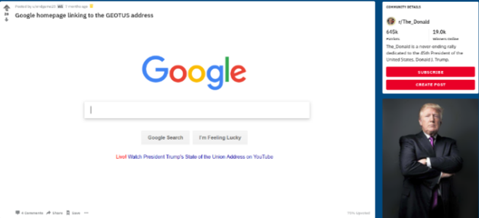 In addition, the Reddit pro-Trump subreddit "The_Donald" posted a screenshot from Google promoting the President's State of the Union address during the actual speech on January 30, 2017 proving Google was promoting the speech while it occurred.