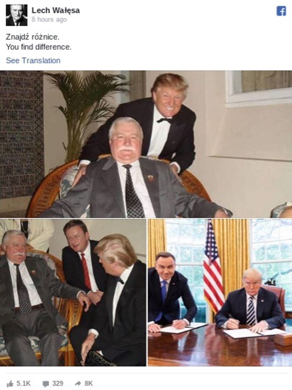 Meanwhile, a Facebook page dedicated to controversial former Polish President Lech Wałęsa appeared to troll President Duda with photos of a meeting between Donald Trump the businessman and Wałęsa and the President Trump photo.