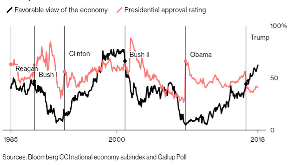 While people see the economy as strong, the job approval rating for President Donald Trump continues to stay below 50 percent and even dips below 40 percent. A look at poll numbers since 1985 shows a trend of strong economies yielding strong job approval for the President in office.