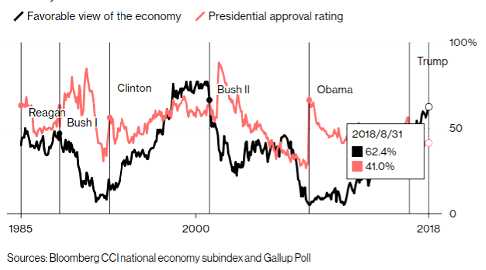 Heading into the midterm elections in November, the head of their party sits not at 63 percent with a 77 percent favored economy—a 14 percentage point discrepancy. Trump sits at 38 percent job approval with a 70 percent approval of the economy—a 32 percentage point discrepancy.