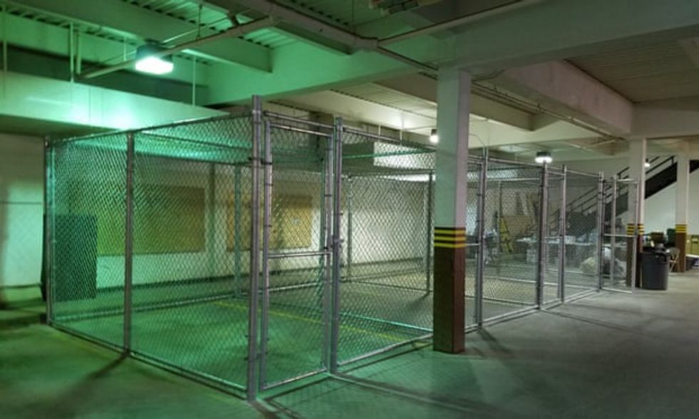 A spokeswoman later sent photographs of the "temporary fenced cubicles" which were "at least" 10 by 14 feet. The photos showa number of parallel cages with ceilings of fencing in a windowless room.