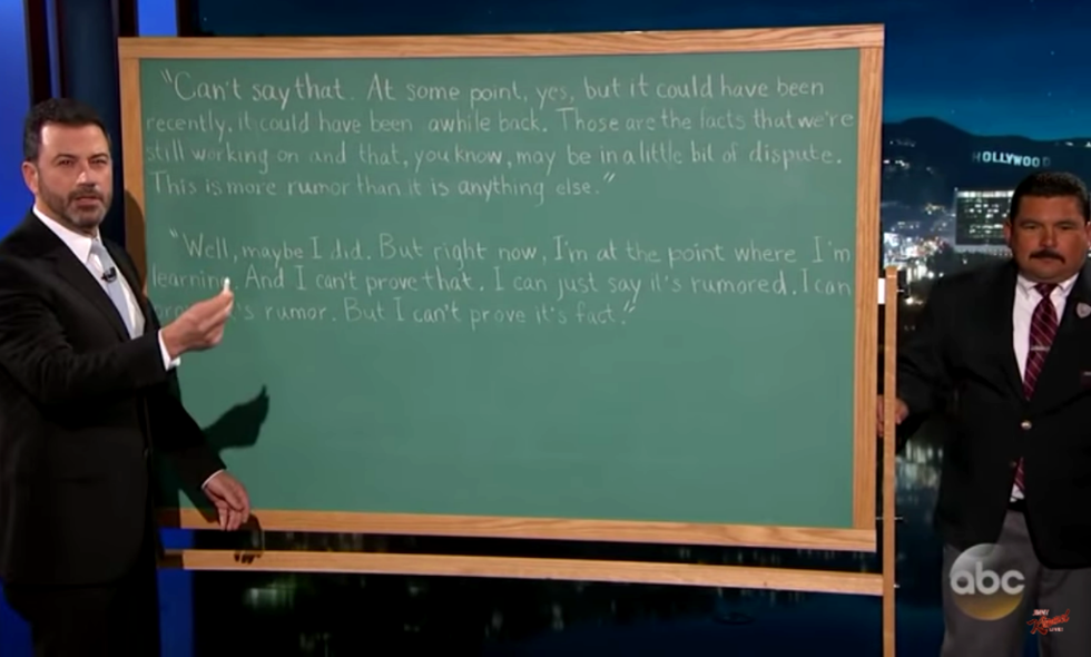 Kimmel then had his security guard, Guillermo Rodriguez, bring out a chalkboard to try to decipher Giuliani's message. After going over it, word for word on the board, Kimmel cracked,