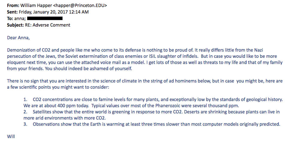 Happer's beliefs don't appear to have changed since then. In 2017, Jezebel published the following email exchange, in which Happer addressed comments from a Jezebel reader named Anna who scrutinized the work he's done for companies in the fossil fuel industry.