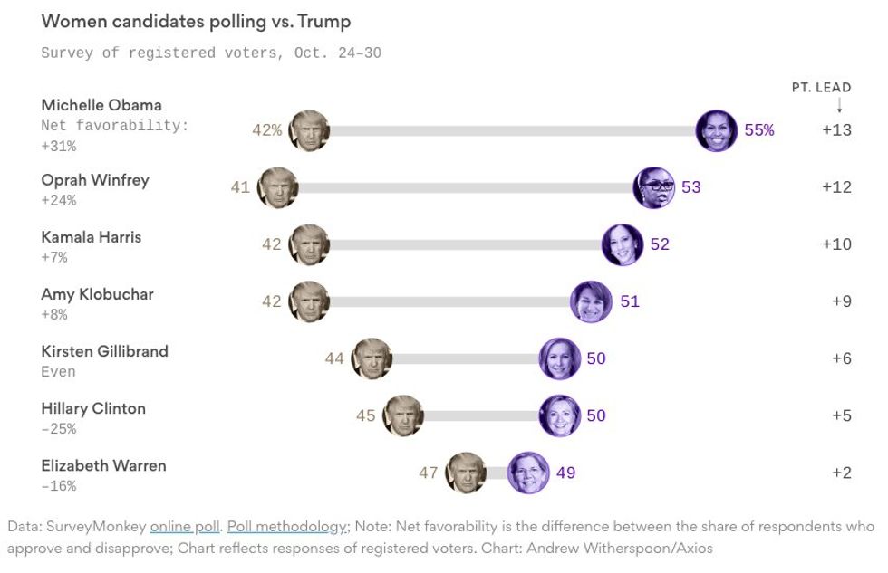 The poll, conducted by Survey Monkey, shows Trump losing the 2020 election - in landslides - to seven potential women candidates. Axios aired the poll results Sunday night on HBO.