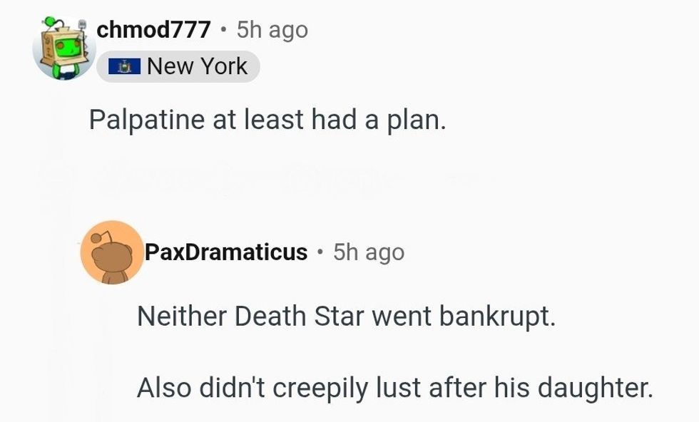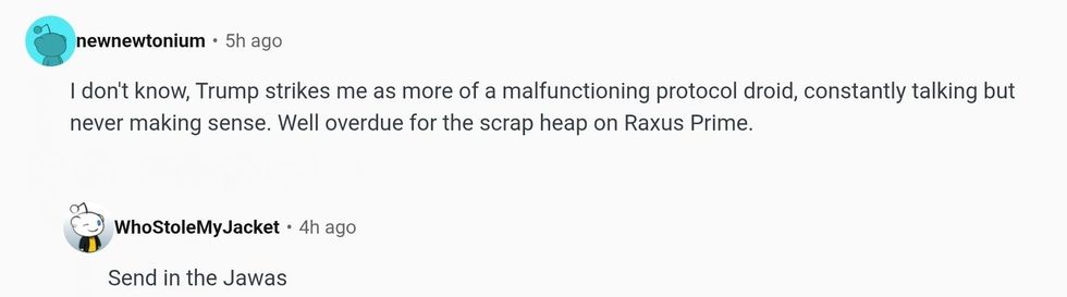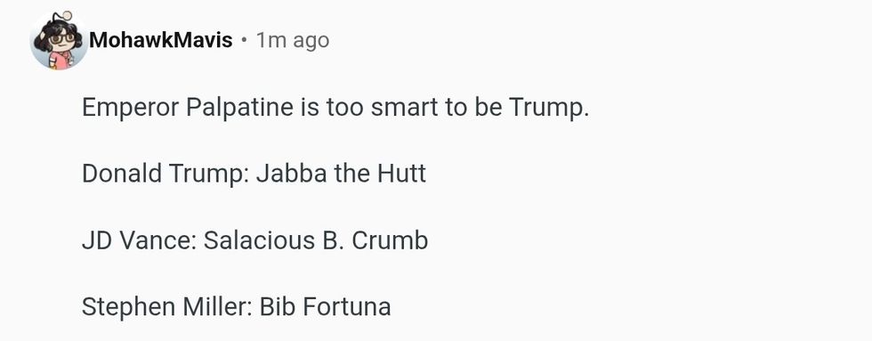The overly dramatic social media posts being compared to speeches by Star Wars villains is obvious. More subtle is mocking Trump's own love of posting AI-generated propaganda videos.