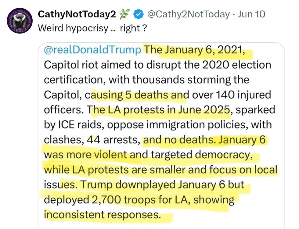 "We made a great decision in sending the National Guard to deal with the violent, instigated riots in California. If we had not done so, Los Angeles would have been completely obliterated. The very incompetent 'Governor', Gavin Newscum, and 'Mayor', Karen Bass, should be saying, 'THANK YOU, PRESIDENT TRUMP, YOU ARE SO WONDERFUL. WE WOULD BE NOTHING WITHOUT YOU, SIR'."