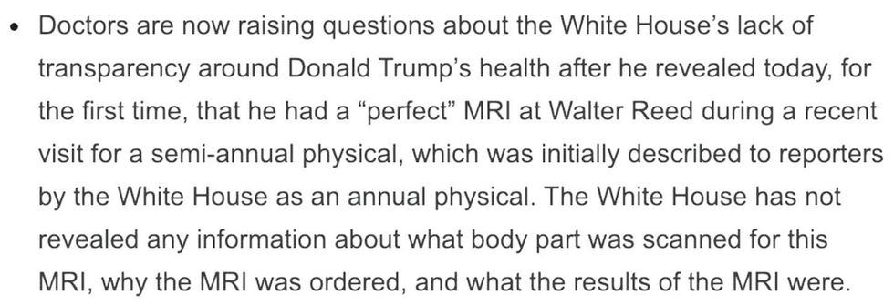On Monday, the White House released a memo about the MRI scan 79-year-old MAGA Republican President Donald Trump undertook during a check-up at Walter Reed Military Medical Center in October.