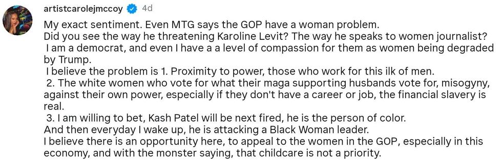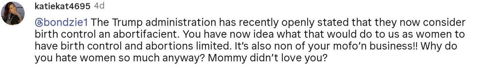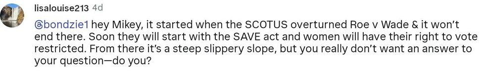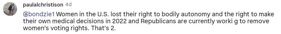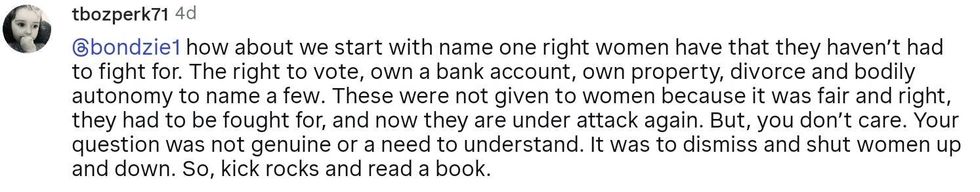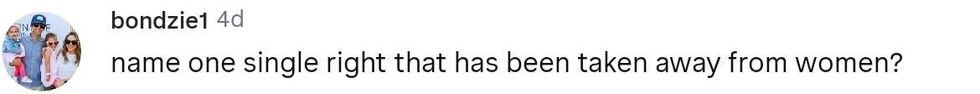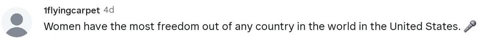 The first to jump into the comments were MAGA men, like bondzie1 and 1flyingcarpet, declaring women have it great and are under no threat.