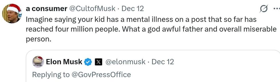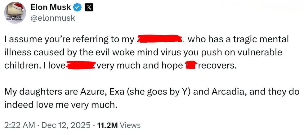 "I assume you’re referring to my [daughter, Vivian], who has a tragic mental illness caused by the evil woke mind virus you push on vulnerable children. I love [Vivian] very much and hope [she] recovers."