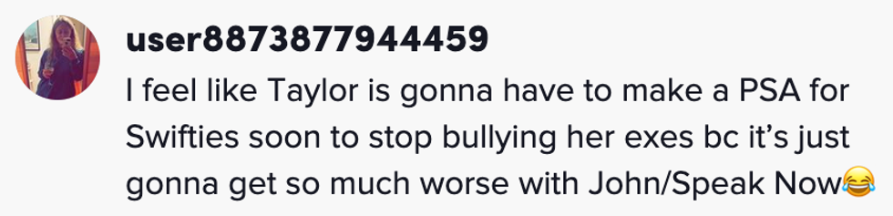 With Swift's next re-recorded release rumored to be the 2010 album Speak Now, which includes the break-up song "Dear John" widely believed to be about John Mayer, it seems unlikely that all this drama on the part of Swift's fans will end any time soon.