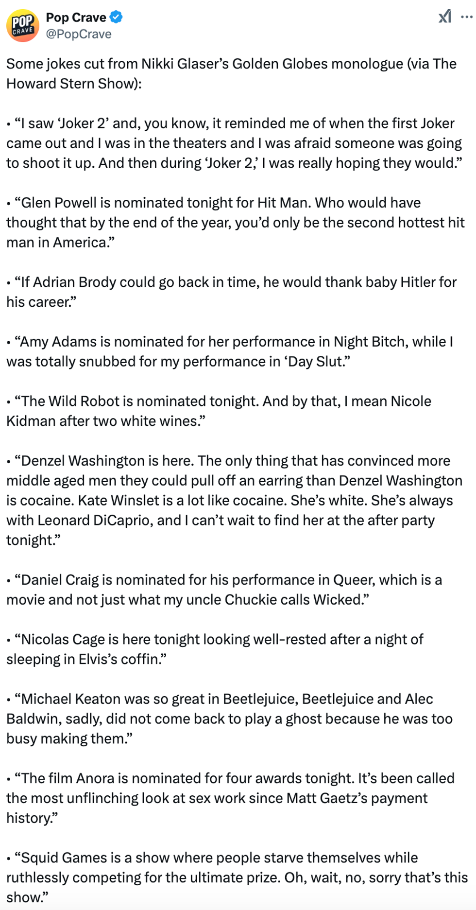 Other cut jokes involved comparing actor Glen Powell to accused assassin Luigi Mangione, and one in which actor Adrien Brody time-travels to thank Hitler for his career following his Globe win for The Brutalist and his 2003 Oscar win for The Pianist, in both of which he played Holocaust survivors.