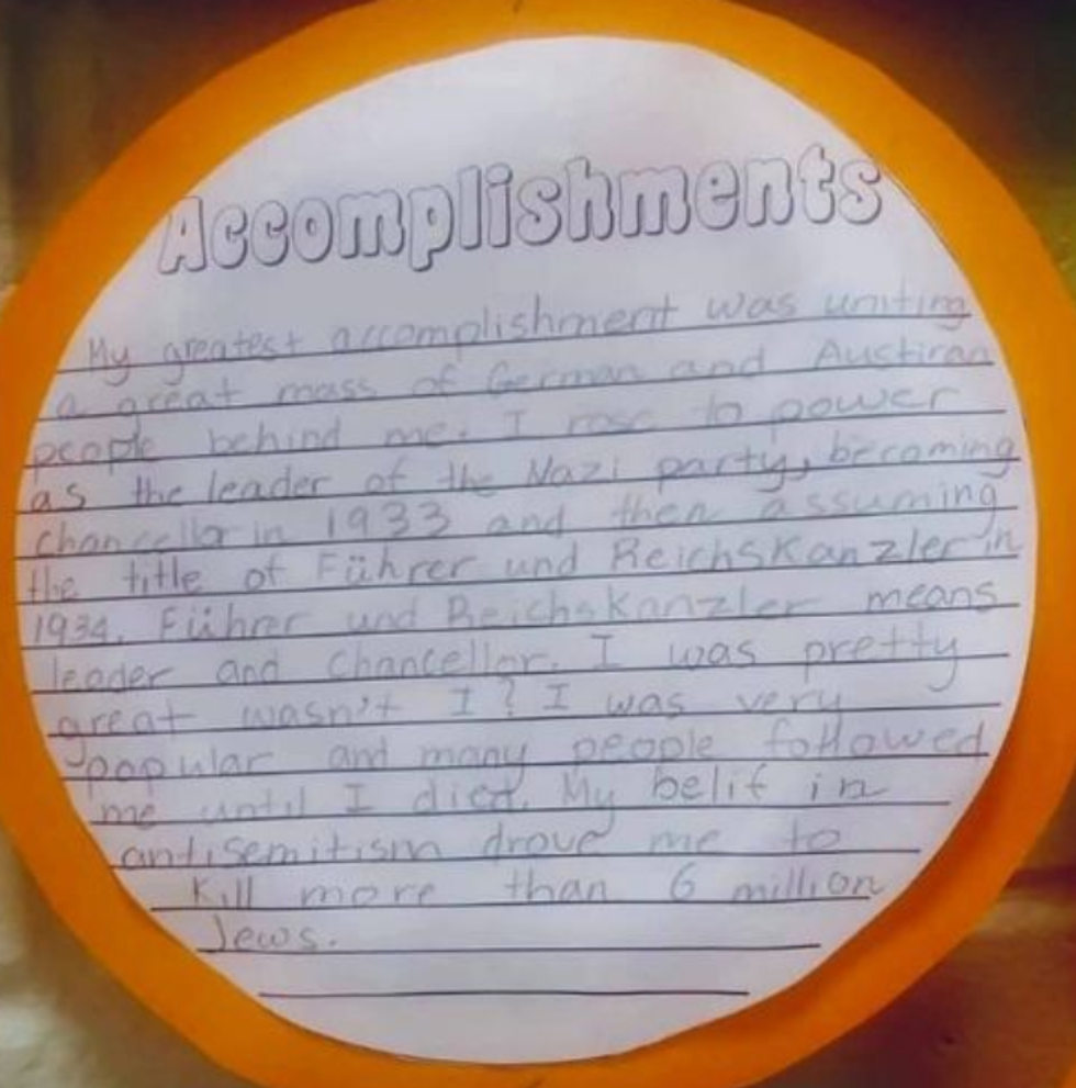 "Regardless of the educational intent here the teacher failed to recognize the profound impact this can have on students, family members and others in our community who could perceive this project as condoning or even glorifying the atrocities of one of the most evil individuals in world history."