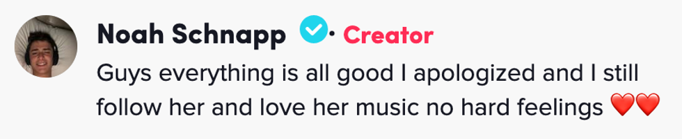 "Guys everything is all good I apologized and I still follow her and love her music no hard feelings."