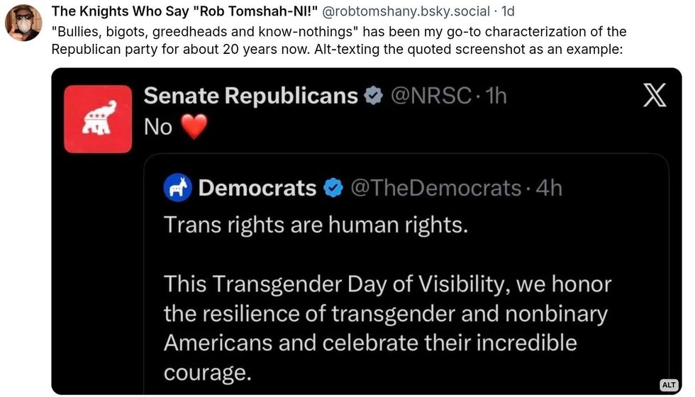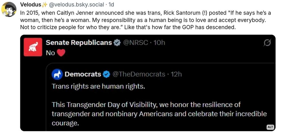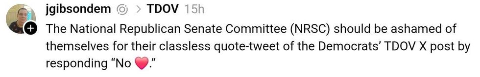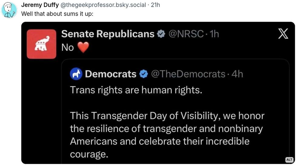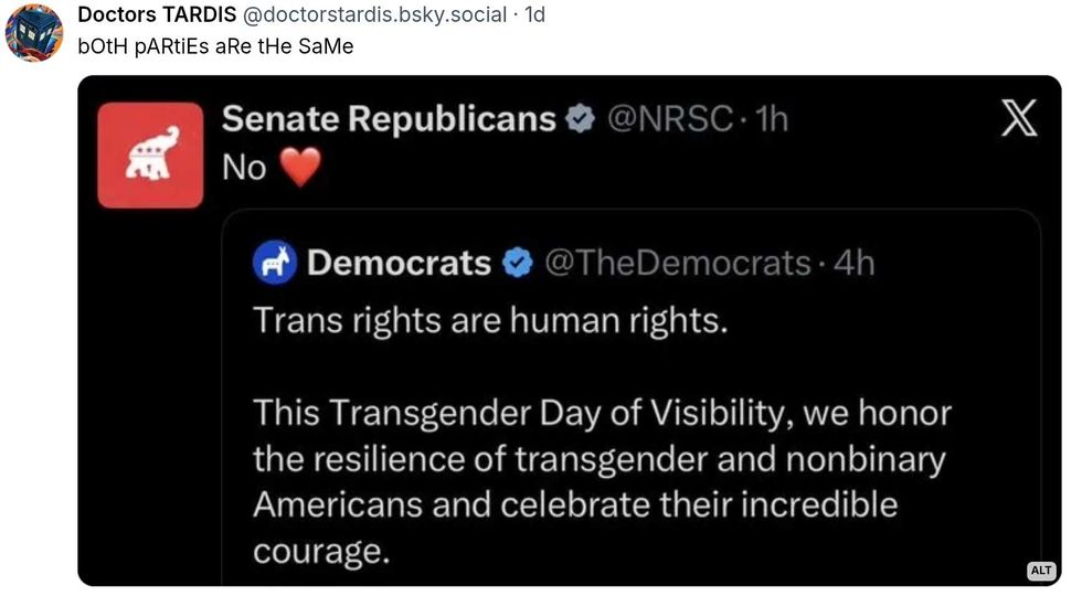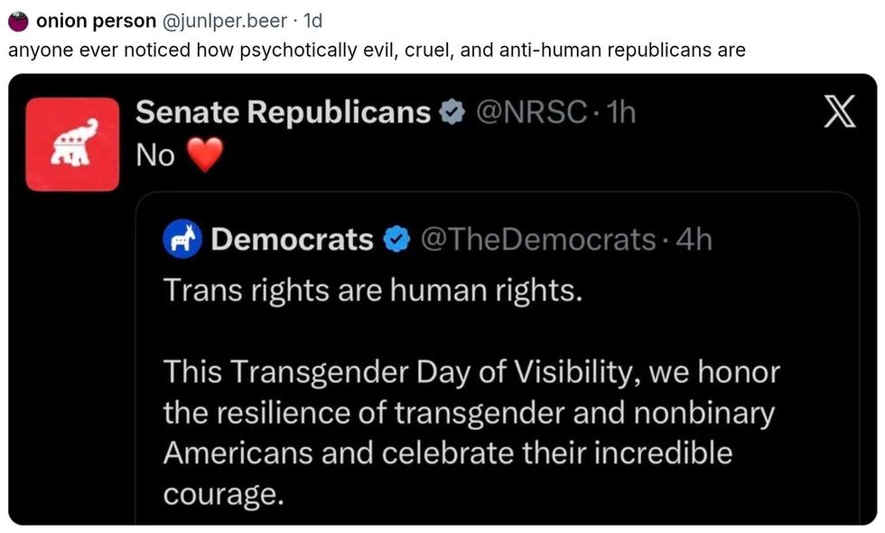 On vocal transphobe Elon Musk’s social media platform X, the National Republican Senatorial Committee decided to repost the DNC's TDOV message.