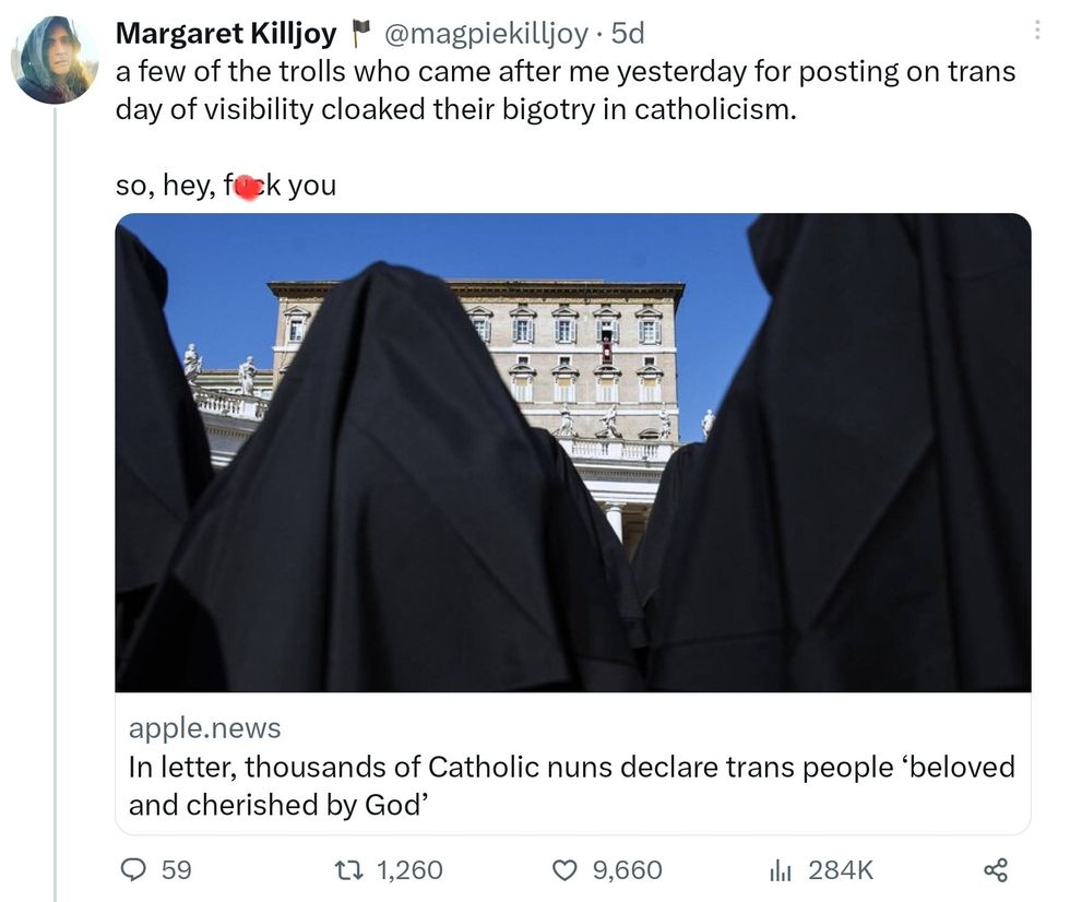 \u201cmy aunt was married to jesus, in the sisters of presentation, and was trans accepting, so ive never doubted that catholicism is capable of accepting trans people.\u201d— Margaret Killjoy \ud83c\udff4 (@Margaret Killjoy \ud83c\udff4) 1680357392