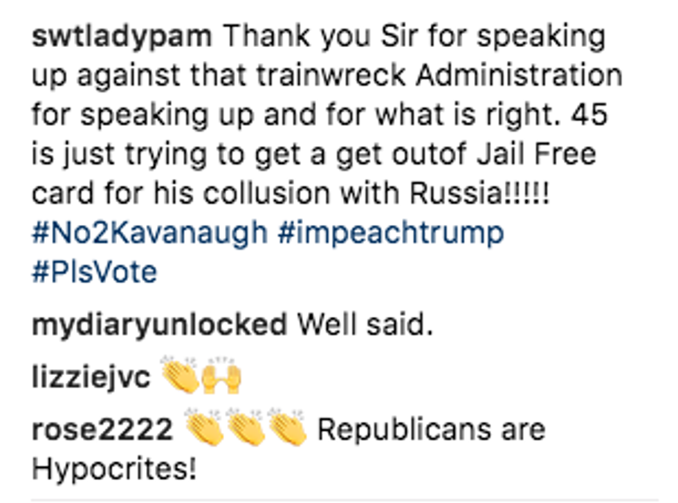Besides Trump, Souza also addressed his post to Sen. Chuck Grassley (R-Iowa), Senate Majority Leader Mitch McConnell (R-KY), Sen. Orrin Hatch (R-UT), Sen. Bob Corker (R-TN), Sen. Lindsey Graham (R-S.C.) and Sen. John Cornyn (R-TX) — all GOP members who have pushed for Kavanaugh to be confirmed to the lifetime appointment immediately.