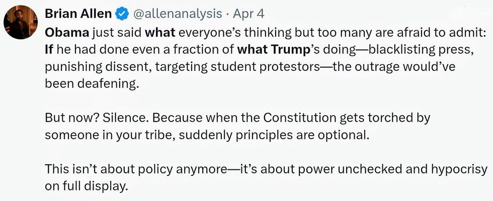 The former POTUS then addressed the Trump administration's intimidation tactics against colleges, universities, the press, and private law firms, saying he was "troubled by the idea that a White House" would stoop to such levels, driven largely by the ego and insecurities of one man.
