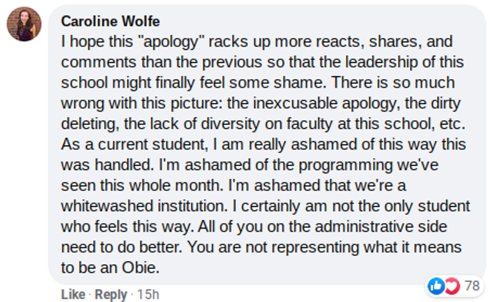 After explaining the various diversity and inclusion efforts the school enstated over the last year, Oberlin closed the statement exactly as foreseen in that outraged comment: