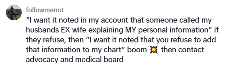 When she responded to the voicemail from the TikToker's husband, instead of calling him back at the number he provided, she instead logged into his medical file without cause to look through his emergency contacts. His ex-wife was still listed somewhere in his file, and she used that phone number to set up the appointment instead of calling him back directly.