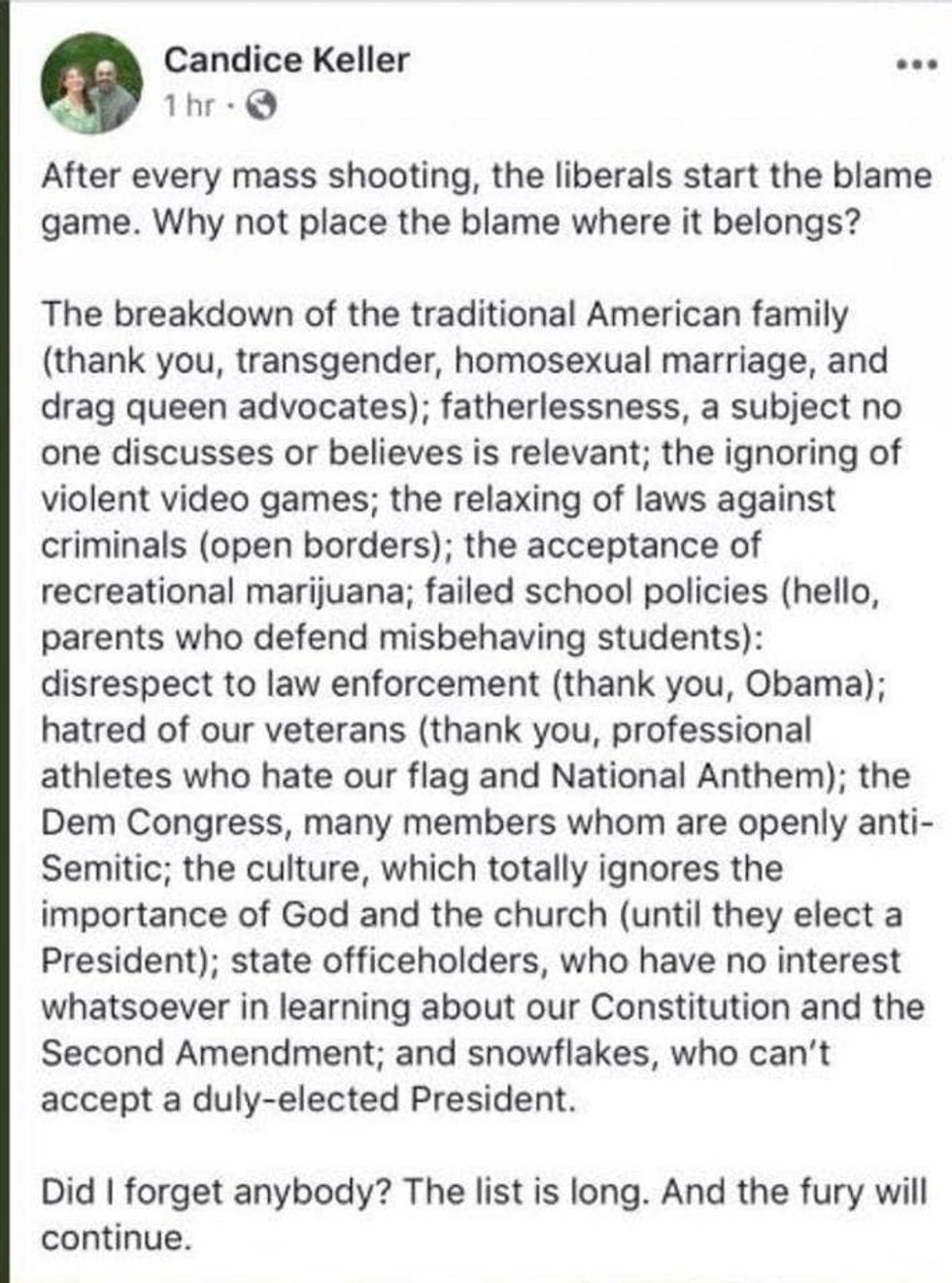 In her now hidden Facebook post, Keller wrote a long list of people and ideologies she blames for the mass shootings. Before you ask, no, the list does not include white supremacy, the wide proliferation of guns or the current administration.