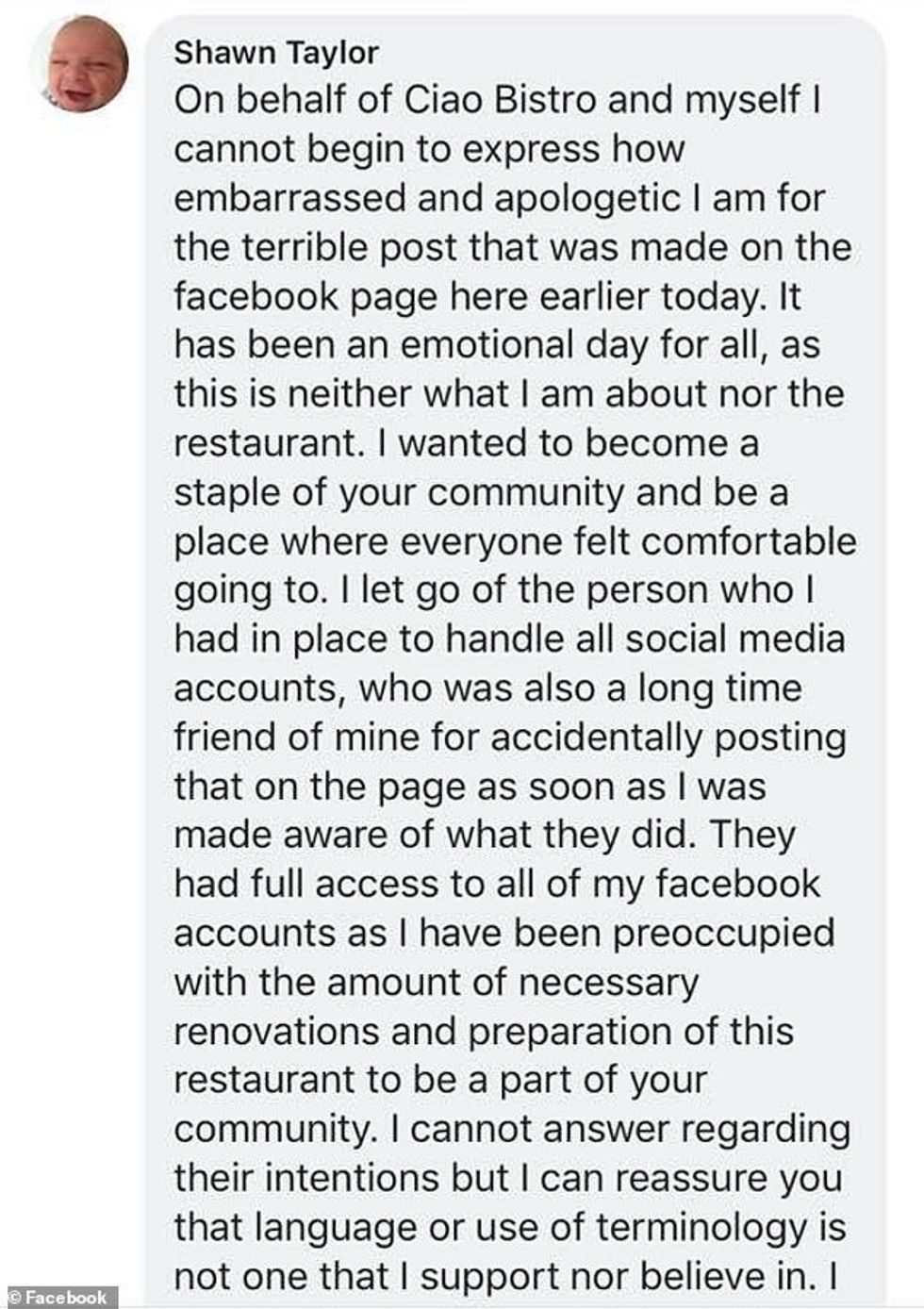 "Woah" indeed. Shawn Taylor is the owner of Ciao, but he claimed he didn't write the comment. People were so angered by the comment that they started messaging the restaurant's social media account letting them know they would never eat there. Comments were made to local newspapers; the restaurant got tons of bad press. Shawn responded by explaining that yes, the comment came from his account, but it wasn't supposed to be a comment, it was supposed to be a text.