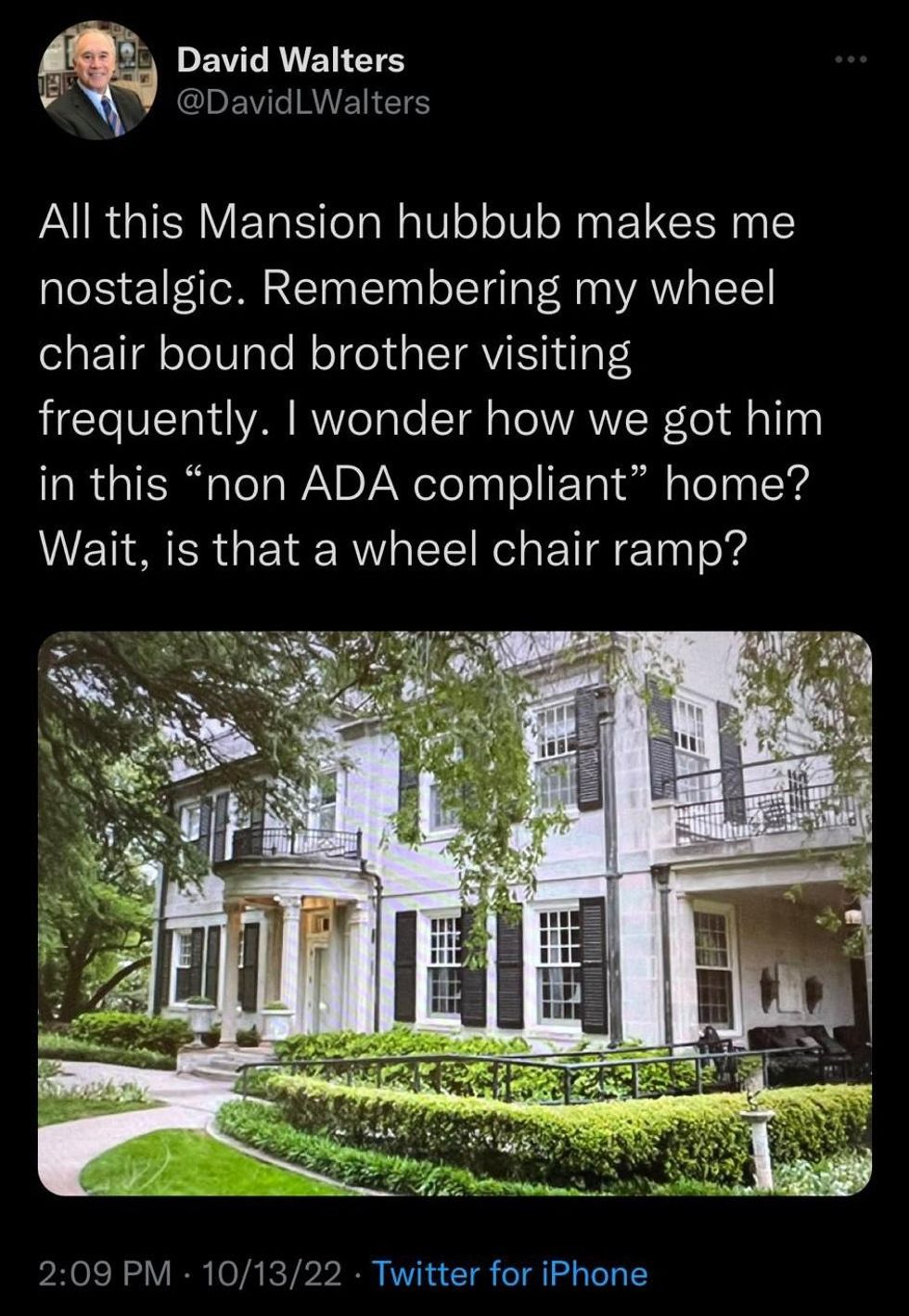 \u201c@kendallybrown Clearly the goal was not to address the ADA access before the secret came out, since they are alleged to have raised the needed amount without any intervention to make the current mansion accessible.\u201d— Kendall Brown (@Kendall Brown) 1665677105