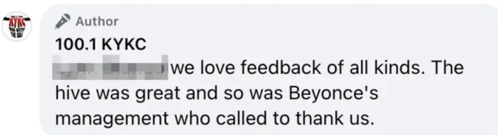 KYKC also mentioned on Facebook that Beyoncé's management team thanked them for playing "Texas Hold 'Em" on their station.